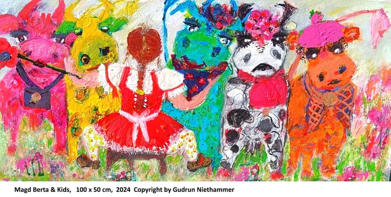 Ob verspielt, charmant oder extravagant, meine Kühe haben Persönlichkeit. Mit Blumenkranz, Schmuck oder keckem Blick werden sie zu Charakterköpfen voller Farbe und Freude.